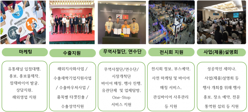 | 전시회 지원 | 전시회 정보, 부스예약, 사전 마케팅 및 바이어 매칭 서비스, 관심바이어 사후관리 등 지원 |